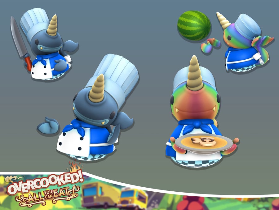 There’s also a total of 128 alternate skins available across the roster of chefs, like this fancy rainbow Narwhal and shiny gold Robot!
